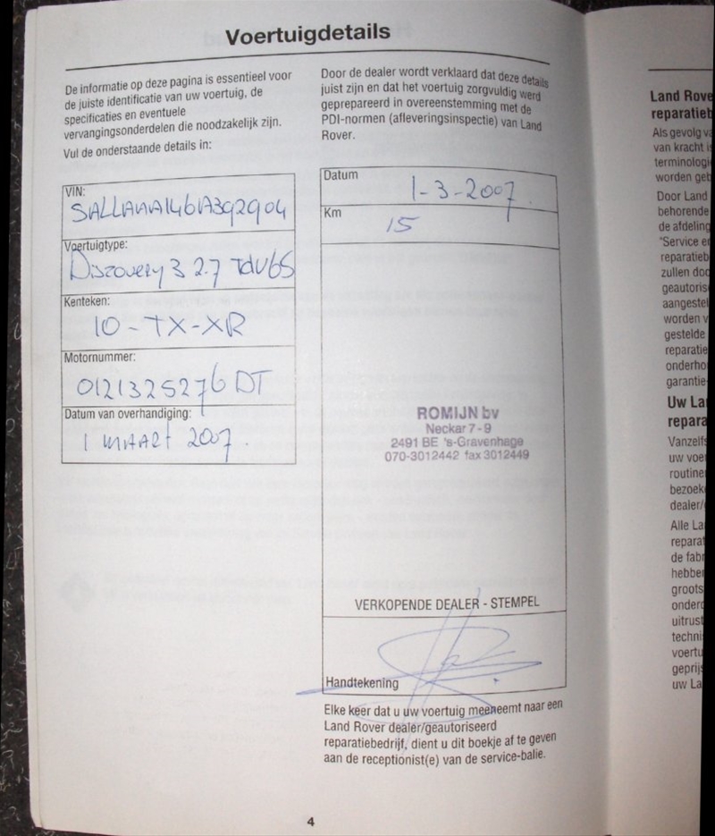 De auto is nieuw gekocht bij Land Rover dealer Romijn in Den Haag en afgeleverd op 1 maart 2007. De huidige (tweede) eigenaar kocht de Discovery op 20 april 2009 met een k.m. stand van 99000 km. Hij heeft de auto tot in de puntjes verzorgd en heeft op tijd onderhoud laten uitvoeren. In die twaalf jaar heeft de auto maar één manco gehad: de accu was leeggelopen. Zowel aan de binnenzijde als de buitenzijde is hij smetteloos. Zelfs onder de motorkap is hij als nieuw. De auto heeft slechts twee kleine minpuntjes: hij heeft een heel klein deukje in het rechter achterportier en in het deurrubber linksvoor zit een scheurtje.