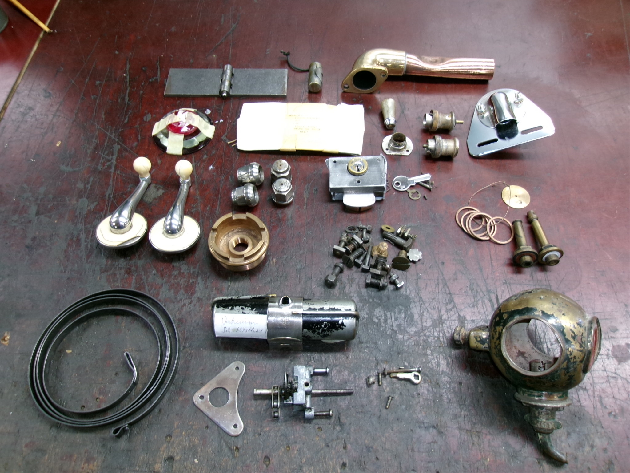 Diverse gebruikte onderdelen voor binnenkant en buitenkant, zoals sloten, klinken, handvatten, enz, voor Rolls-Royce Silver Ghost rond 1923. Vraagprijs € 150,00.